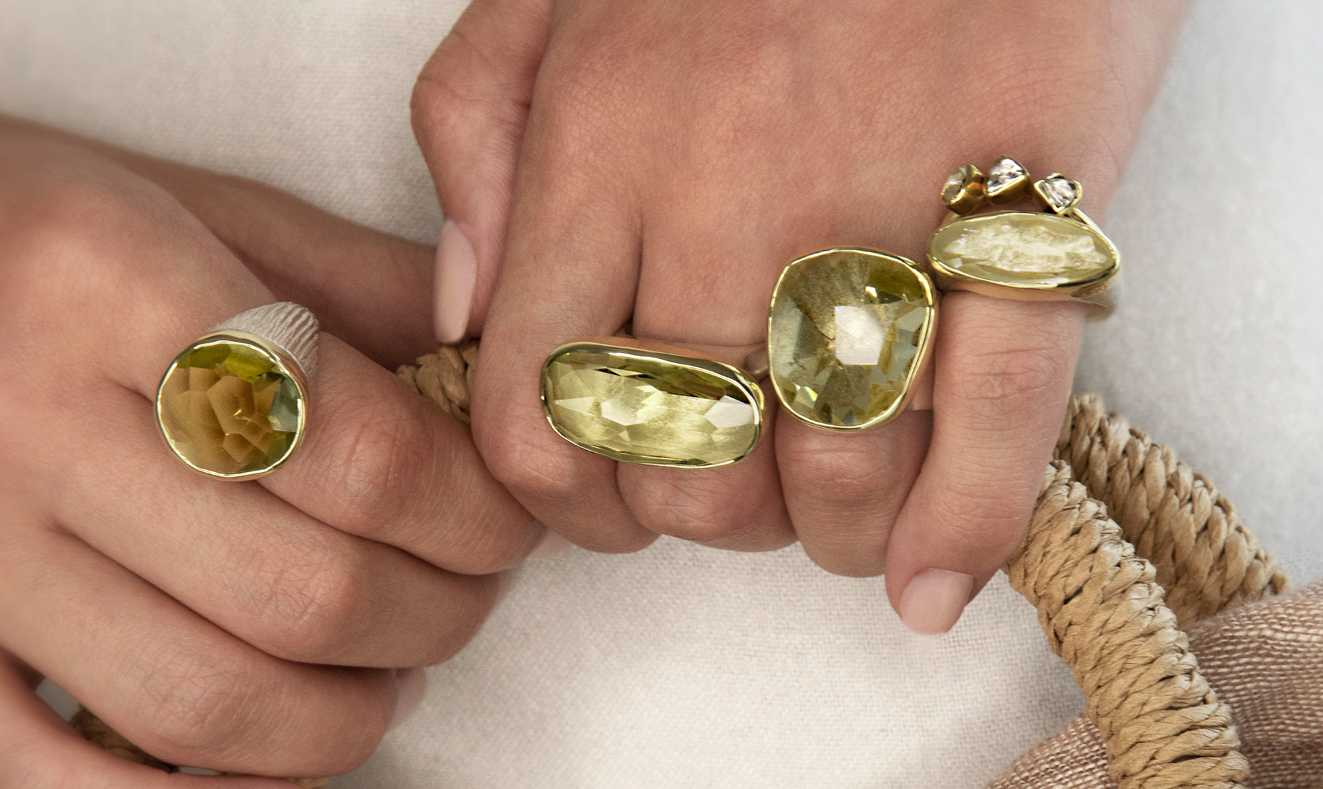 Semi-precious stones, always in the starring role, retain their authenticity, raw or minimally cut, they allow light to dance freely upon them, revealing unique shades and inner brilliance.